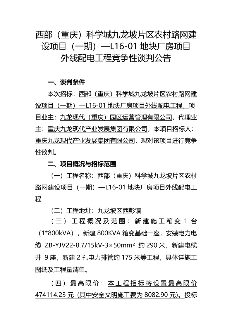 西部(重庆)科学城九龙坡片区农村路网建设项目(一期)—L16-01地块厂房项目外线配电工程竞争性谈判公告