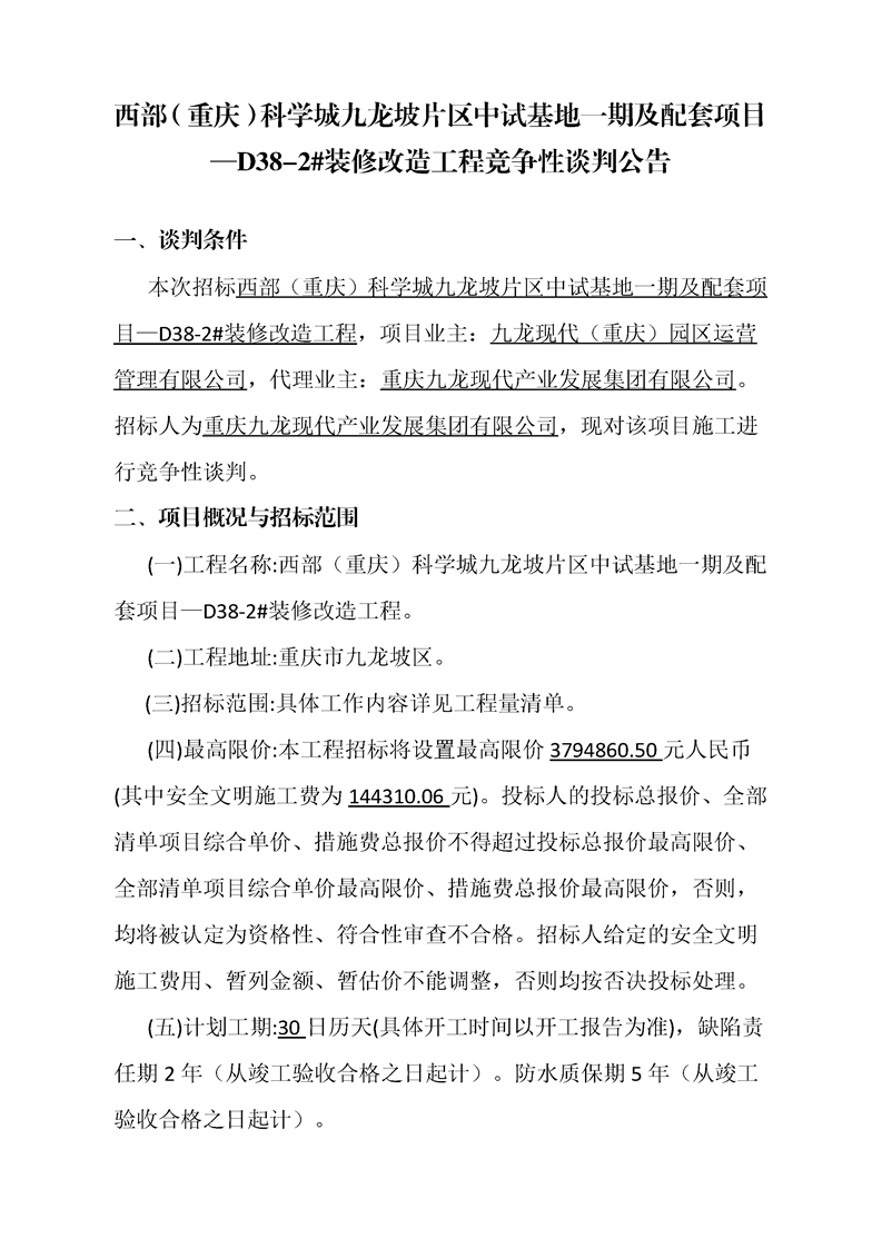 西部(重庆)科学城九龙坡片区中试基地一期及配套项目—D38-2#装修改造工程竞争性谈判公告
