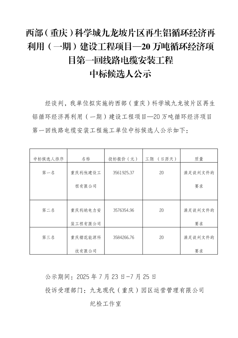 西部(重庆)科学城九龙坡片区再生铝循环经济再利用(一期)建设工程项目—20万吨循环经济项目第一回线路电缆安装工程中标候选人公示