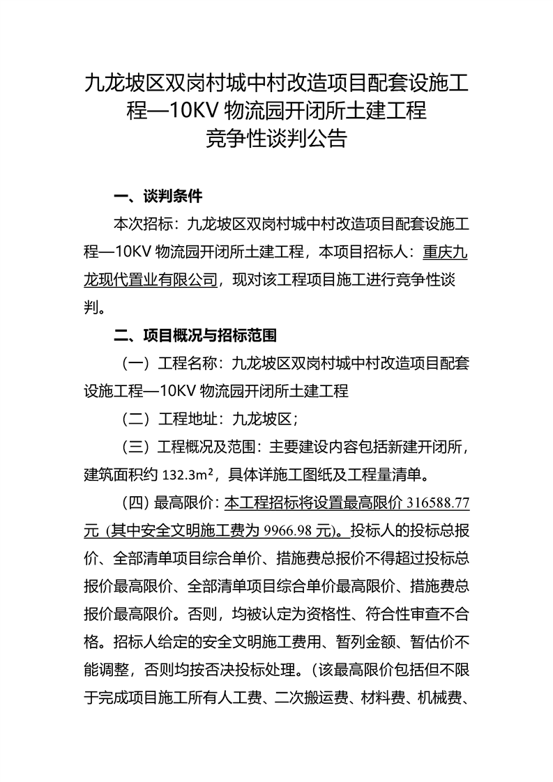 九龙坡区双岗村城中村改造项目配套设施工程—10KV物流园开闭所土建工程竞争性谈判公告