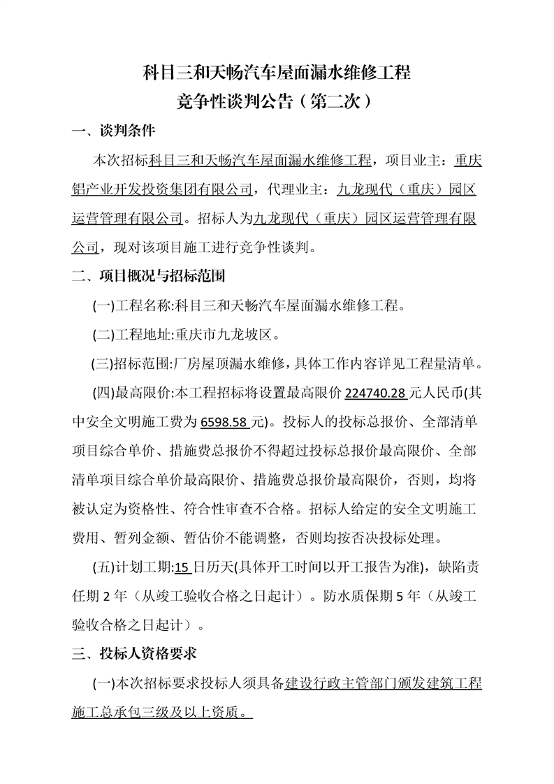 科目三和天畅汽车屋面漏水维修工程竞争性谈判公告(第二次)