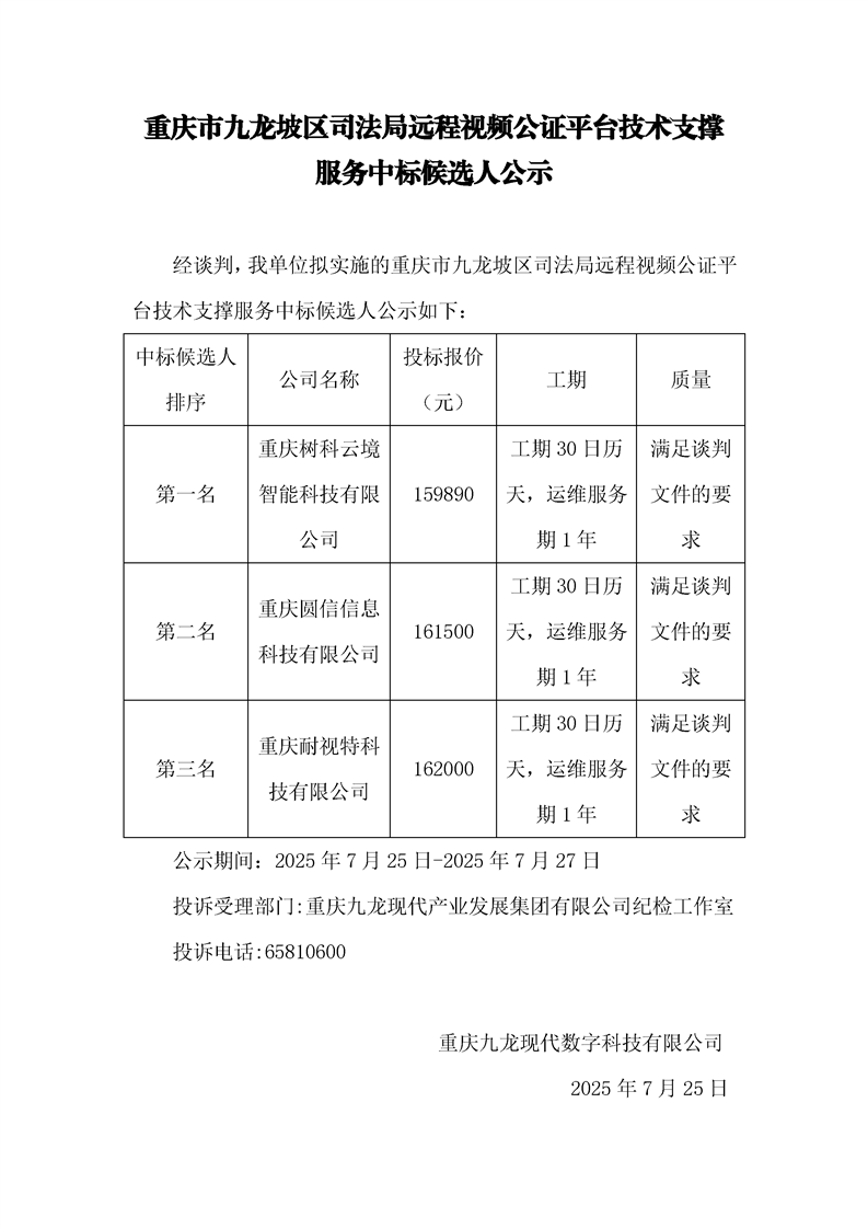 重庆市九龙坡区司法局远程视频公证平台技术支撑服务中标候选人公示