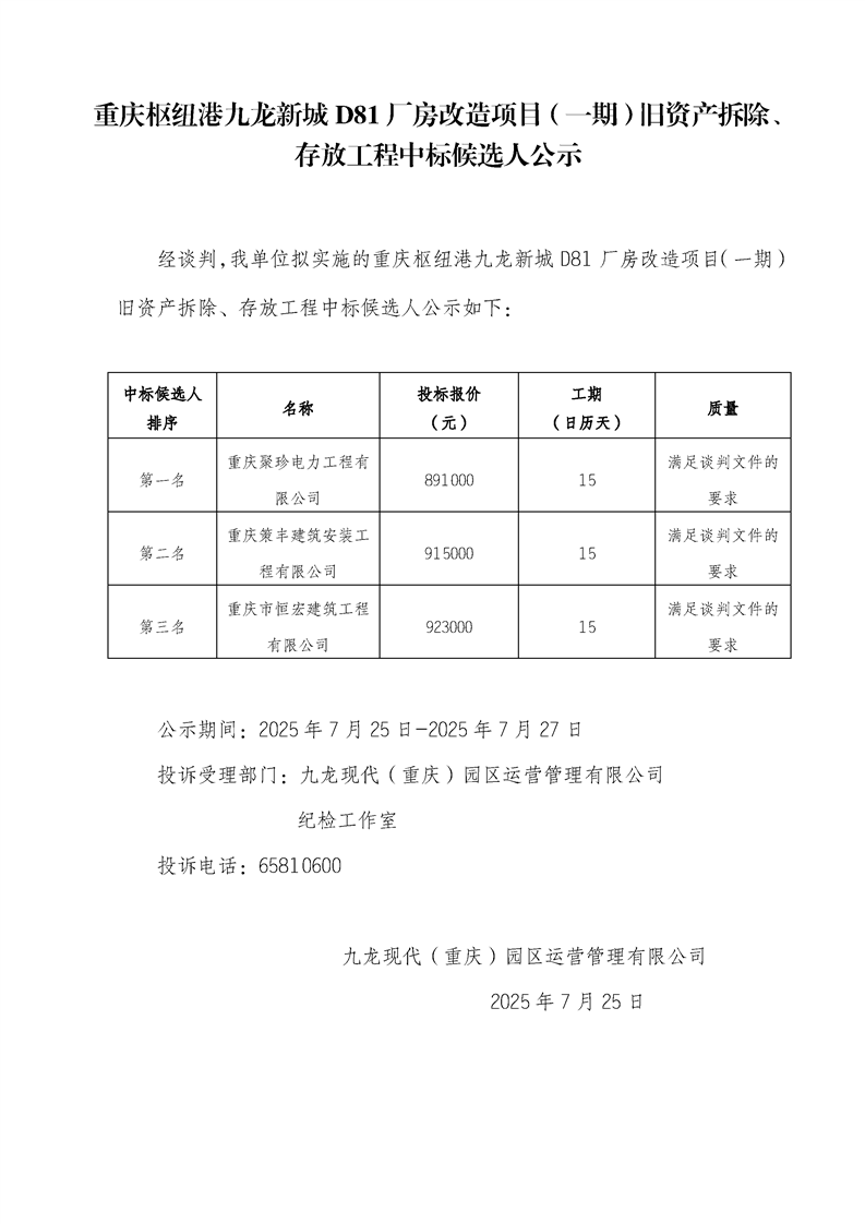 重庆枢纽港九龙新城D81厂房改造项目(一期)旧资产拆除、存放工程中标候选人公示