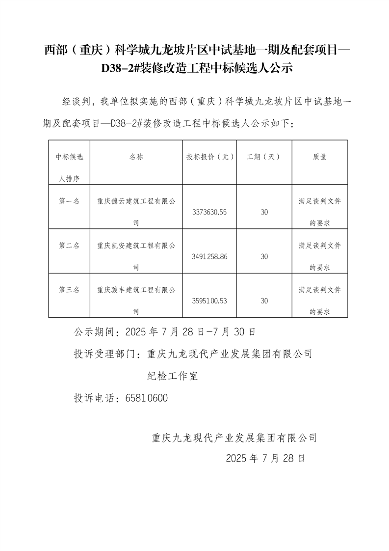 西部(重庆)科学城九龙坡片区中试基地一期及配套项目—D38-2#装修改造工程中标候选人公示