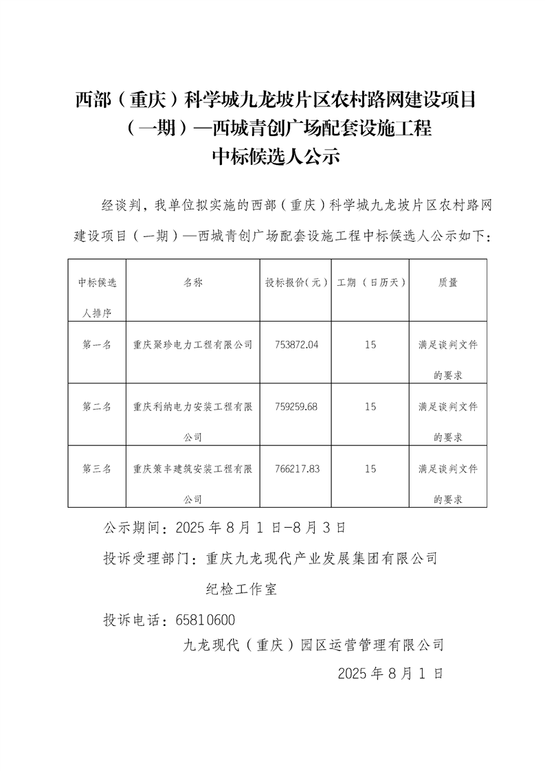 西部(重庆)科学城九龙坡片区农村路网建设项目中标候选人公示