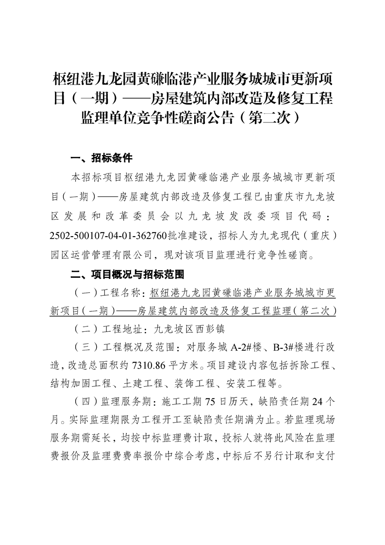 枢纽港九龙园黄磏临港产业服务城城市更新项目(一期)——房屋建筑内部改造及修复工程监理单位竞争性磋商公告(第二次)