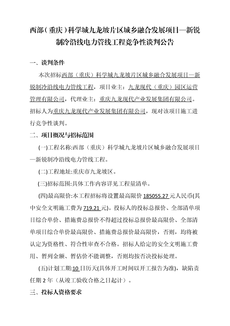 西部(重庆)科学城九龙坡片区城乡融合发展项目—新锐制冷沿线电力管线工程竞争性谈判公告