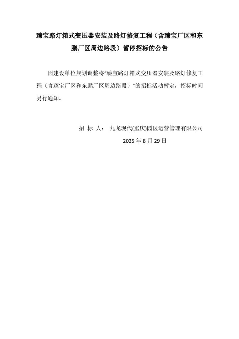 臻宝路灯箱式变压器安装及路灯修复工程(含臻宝厂区和东鹏厂区周边路段)暂停招标的公告