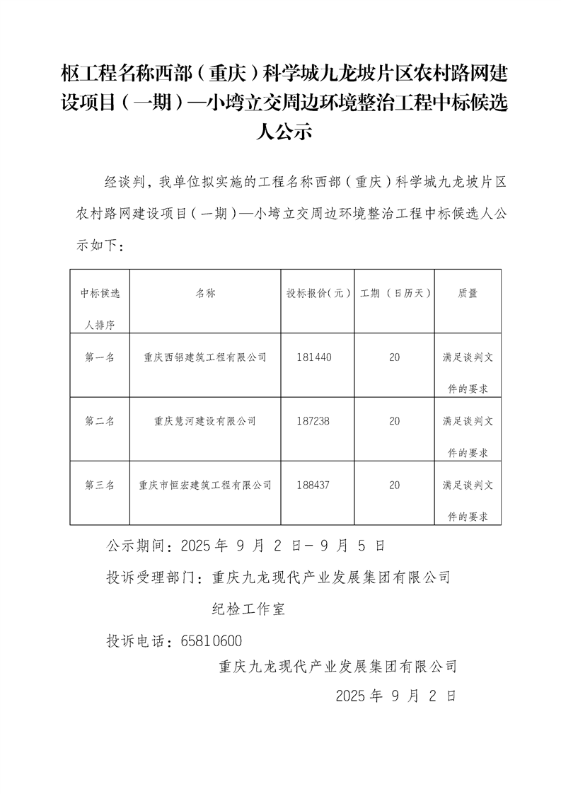 枢工程名称西部(重庆)科学城九龙坡片区农村路网建设项目(一期)—小塆立交周边环境整治工程中标候选人公示