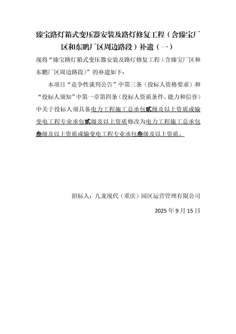 臻宝路灯箱式变压器安装及路灯修复工程(含臻宝厂区和东鹏厂区周边路段)补遗(一)