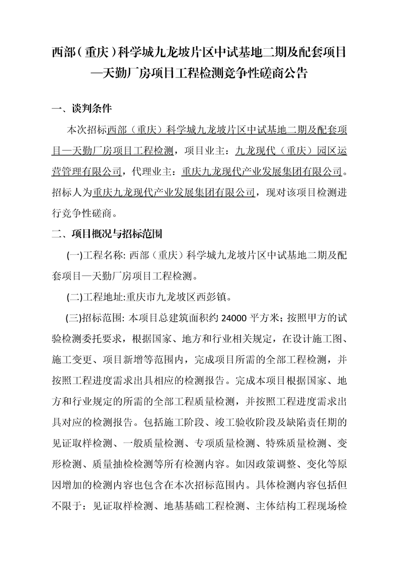 西部(重庆)科学城九龙坡片区中试基地二期及配套项目—天勤厂房项目工程检测竞争性磋商公告