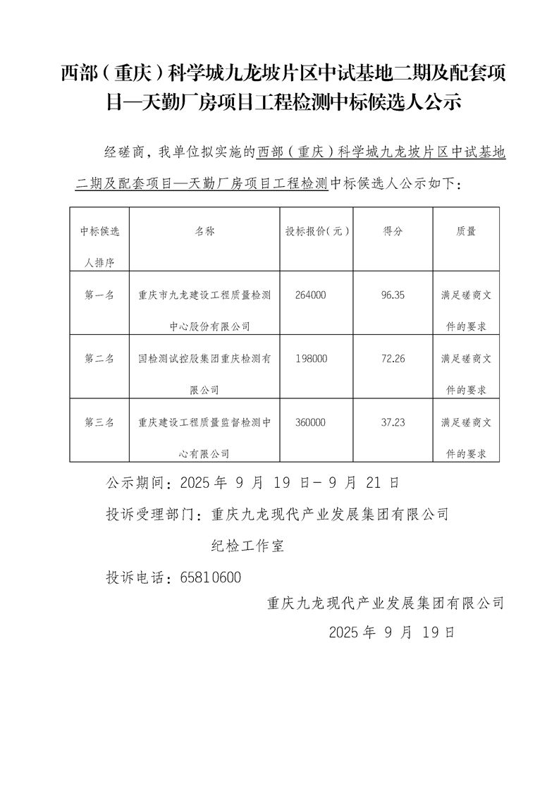 西部(重庆)科学城九龙坡片区中试基地二期及配套项目—天勤厂房项目工程检测中标候选人公示
