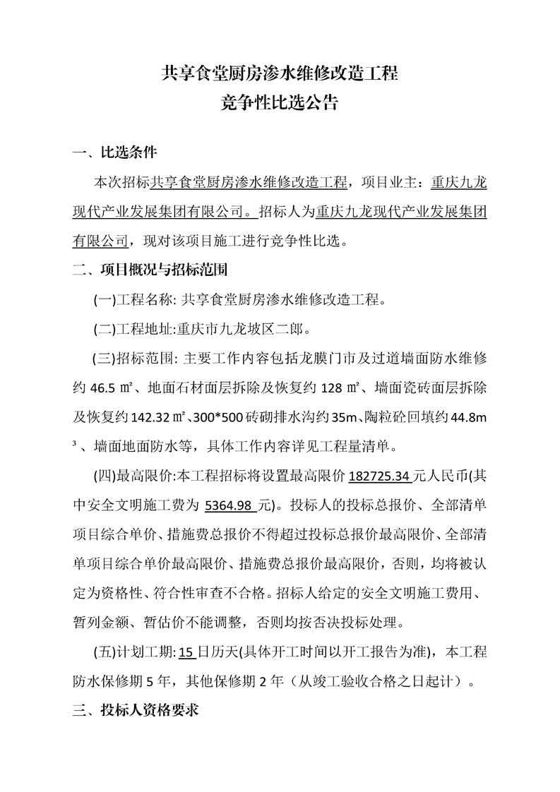 共享食堂厨房渗水维修改造工程竞争性比选公告