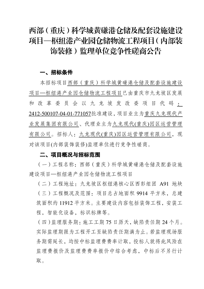 西部(重庆)科学城黄磏港仓储及配套设施建设项目—枢纽港产业园仓储物流工程项目(内部装饰装修)监理单位竞争性磋商公告