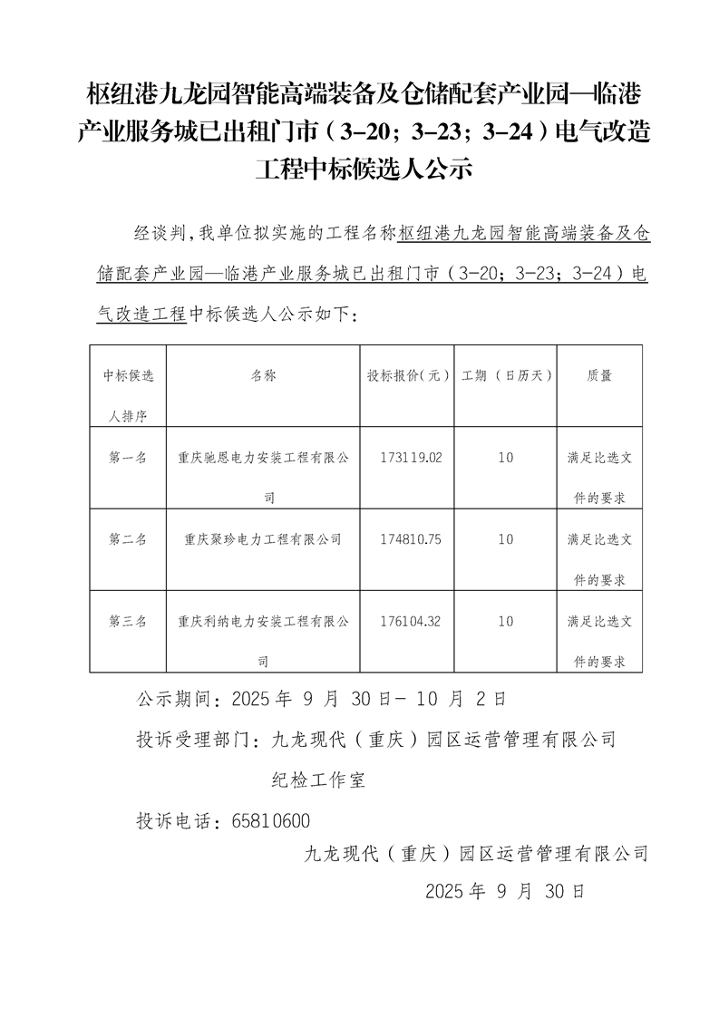 枢纽港九龙园智能高端装备及仓储配套产业园—临港产业服务城已出租门市(3-20;3-23;3-24)电气改造工程中标候选人公示